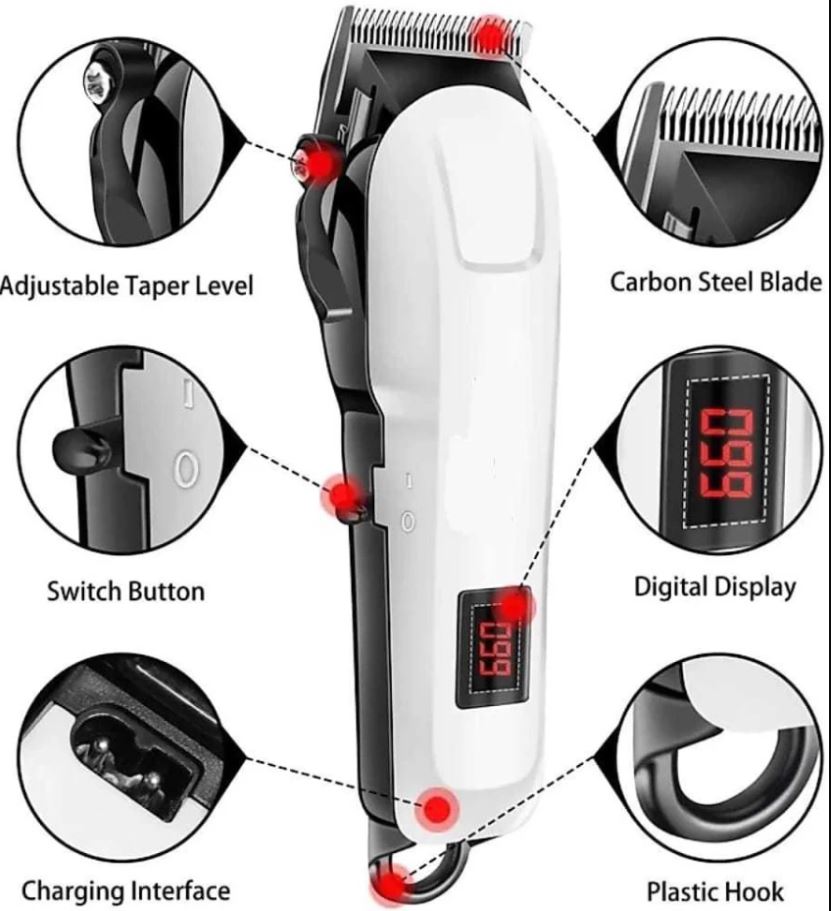 Selain itu, ada layar LCD di bodi, yang memudahkan Anda memangkas rambut dengan tampilan listrik intuitif.
